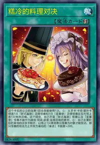①:从手卡·卡组·额外卡组选1只「新式魔厨」灵摆怪兽和1只「圣菓使」灵摆怪兽在双方场上各1只特殊召唤。这个回合,自己不是「新式魔厨」怪兽以及「圣菓使」怪兽不能作为融合·同调·超量·连接召唤的素材。