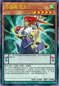 ①:这张卡召唤成功时才能发动。和自己的灵摆区域的卡相同纵列的自己的卡全部回到持有者手卡。那之后,可以从卡组把「弓道魂 范士」以外的1只攻击力2400/守备力1000的怪兽加入手卡。