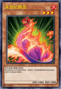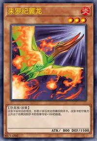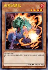 这张卡被战斗破坏的场合,在自己场上把2只「朱罗纪衍生物」(恐龙族·炎·1星·攻0/守0)守备表示特殊召唤。这衍生物不能为名字带有「朱罗纪」的怪兽以外的上级召唤而解放。
