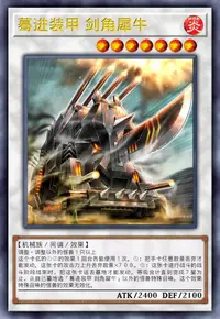 ②:这张卡进行战斗的战斗阶段结束时,把这张卡送去墓地才能发动。等级合计直到变成7星为止,从自己墓地选「蓦进装甲 剑角犀牛」以外的怪兽特殊召唤。这个效果特殊召唤的怪兽的效果无效化。