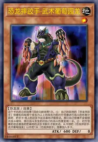 ②:对方怪兽的攻击宣言时把墓地的这张卡除外才能发动。从卡组把「恐龙摔跤手·武术葡萄园龙」以外的1只「恐龙摔跤手」怪兽加入手卡。