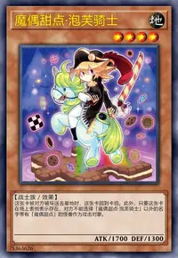 这张卡被对方破坏送去墓地时,这张卡回到卡组。此外,只要这张卡在场上表侧表示存在,对方不能选择「魔偶甜点·泡芙骑士」以外的名字带有「魔偶甜点」的怪兽作为攻击对象。