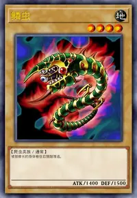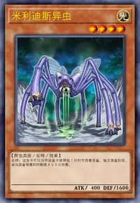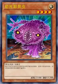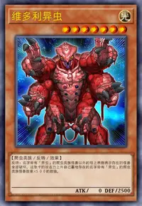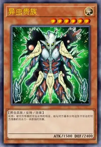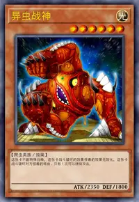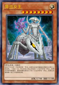 这张卡的守备力上升自己墓地存在的名字带有「异虫」的爬虫类族怪兽数量×100的数值。这张卡被攻击,对方玩家受到战斗伤害的场合,那个伤害步骤结束时把对方场上存在的1张魔法或者陷阱卡破坏。