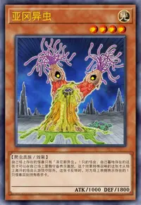 这张卡召唤成功时,可以从自己卡组把1只名字带有「异虫」的爬虫类族怪兽送去墓地。自己场上有「亚冈异虫」表侧表示存在的场合,这张卡不会被战斗破坏。