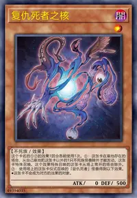 ①:以对方场上1只表侧表示怪兽为对象才能发动。那只怪兽解放,把持有和那个原本等级相同等级的1只「复仇死者衍生物」(不死族·暗·攻/守0)在自己场上特殊召唤。只要这个效果特殊召唤的衍生物在怪兽区域存在,自己不是「复仇死者」怪兽不能召唤·特殊召唤。