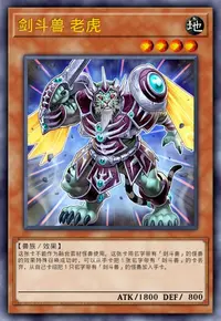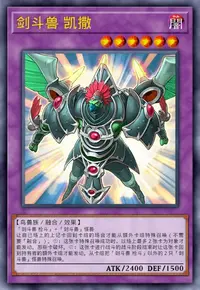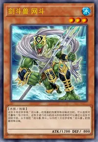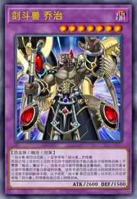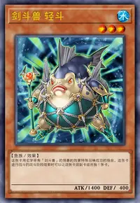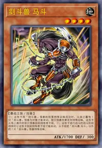 这张卡用名字带有「剑斗兽」的怪兽的效果特殊召唤成功时,把场上1只表侧表示怪兽破坏。这张卡进行战斗的战斗阶段结束时可以让这张卡回到卡组,从卡组把「剑斗兽 鱼斗」以外的1只名字带有「剑斗兽」的怪兽在自己场上特殊召唤。