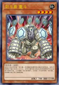 这张卡用名字带有「剑斗兽」的怪兽的效果特殊召唤成功的场合,这张卡的原本守备力变成2400。这张卡进行战斗的战斗阶段结束时可以让这张卡回到卡组,从卡组把「剑斗兽 重斗」以外的1只名字带有「剑斗兽」的怪兽在自己场上特殊召唤。