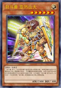 「剑斗兽 双斗」以外的效果不能把这张卡特殊召唤。特殊召唤的这张卡只要在自己场上表侧表示存在,不受魔法的效果的影响。这张卡进行战斗的战斗阶段结束时可以让这张卡回到卡组,从卡组把「剑斗兽 亚历山大」以外的1只名字带有「剑斗兽」的怪兽在自己场上特殊召唤。