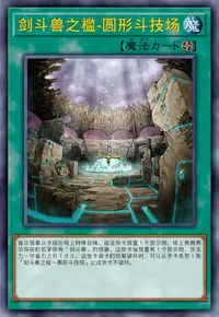 每次怪兽从卡组在场上特殊召唤,给这张卡放置1个指示物。场上表侧表示存在的名字带有「剑斗兽」的怪兽,这张卡每放置有1个指示物,攻击力·守备力上升100。这张卡被卡的效果破坏时,可以从手卡丢弃1张「剑斗兽之槛-圆形斗技场」让这张卡不破坏。