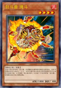 这张卡用名字带有「剑斗兽」的怪兽的效果特殊召唤成功的场合,这张卡的原本攻击力变成2100。这张卡进行战斗的战斗阶段结束时可以让这张卡回到卡组,从卡组把「剑斗兽 绳斗」以外的1只名字带有「剑斗兽」的怪兽在自己场上特殊召唤。
