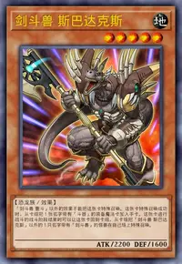 「剑斗兽 重斗」以外的效果不能把这张卡特殊召唤。这张卡特殊召唤成功时,从卡组把1张名字带有「斗器」的装备魔法卡加入手卡。这张卡进行战斗的战斗阶段结束时可以让这张卡回到卡组,从卡组把「剑斗兽 斯巴达克斯」以外的1只名字带有「剑斗兽」的怪兽在自己场上特殊召唤。