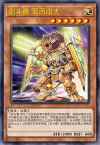 「剑斗兽 双斗」以外的效果不能把这张卡特殊召唤。特殊召唤的这张卡只要在自己场上表侧表示存在,不受魔法的效果的影响。这张卡进行战斗的战斗阶段结束时可以让这张卡回到卡组,从卡组把「剑斗兽 亚历山大」以外的1只名字带有「剑斗兽」的怪兽在自己场上特殊召唤。