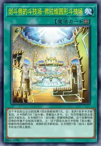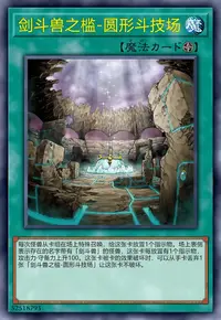 每次怪兽从卡组在场上特殊召唤,给这张卡放置1个指示物。场上表侧表示存在的名字带有「剑斗兽」的怪兽,这张卡每放置有1个指示物,攻击力·守备力上升100。这张卡被卡的效果破坏时,可以从手卡丢弃1张「剑斗兽之槛-圆形斗技场」让这张卡不破坏。