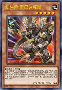 把自己场上存在的上记的卡回到卡组的场合才能从融合卡组特殊召唤(不需要「融合」魔法卡)。这张卡战斗破坏怪兽送去墓地时,给与对方基本分破坏怪兽的守备力数值的伤害。这张卡进行战斗的战斗阶段结束时可以让这张卡回到融合卡组,从卡组把「剑斗兽 斯巴达克斯」以外的2只名字带有「剑斗兽」的怪兽在自己场上特殊召唤。