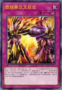 自己场上的名字带有「燃烧拳击手」的怪兽和对方怪兽进行战斗的攻击宣言时才能发动。那次攻击无效,那只自己怪兽送去墓地。自己场上1只名字带有「燃烧拳击手」的怪兽的攻击力上升那只对方怪兽的原本攻击力数值,和那只对方怪兽进行伤害计算。那之后,自己受到这张卡的效果上升的攻击力数值的伤害。