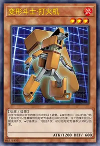 ●守备表示:1回合1次,可以给这张卡放置1个变形斗士指示物。可以把这张卡解放,给与对方基本分这张卡放置的变形斗士指示物数量×1000的数值的伤害。