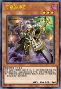 这张卡可以把1只名字带有「守墓」的怪兽解放作召唤。这张卡的攻击力上升自己墓地存在的名字带有「守墓」的怪兽数量×200的数值。场上表侧表示存在的这张卡被破坏的场合,可以作为代替从手卡把1只名字带有「守墓」的怪兽丢弃。
