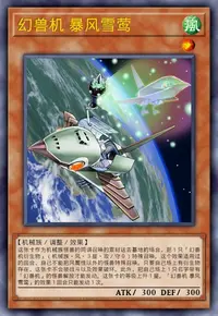这张卡作为机械族怪兽的同调召唤的素材送去墓地的场合,把1只「幻兽机衍生物」(机械族·风·3星·攻/守0)特殊召唤。这个效果适用过的回合,自己不能把风属性以外的怪兽特殊召唤。只要自己场上有衍生物存在,这张卡不会被战斗以及效果破坏。此外,把自己场上1只名字带有「幻兽机」的怪兽解放才能发动。这张卡的等级上升1星。「幻兽机 暴风雪莺」的效果1回合只能发动1次。