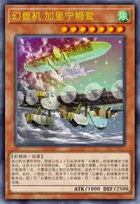 自己的主要阶段时,把自己场上2只名字带有「幻兽机」的怪兽解放才能发动。这张卡从手卡特殊召唤。「幻兽机 加里宁狮鹫」的这个效果1回合只能使用1次。只要自己场上有衍生物存在,这张卡不会被战斗以及效果破坏。此外,1回合1次,把手卡1只名字带有「幻兽机」的怪兽丢弃才能发动。把1只「幻兽机衍生物」(机械族·风·3星·攻/守0)特殊召唤。