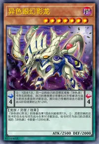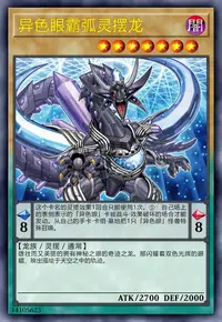 ①:这张卡在手卡的场合,把自己场上1只暗属性怪兽解放才能发动。从手卡·卡组以及自己场上的表侧表示怪兽之中选1只「异色眼龙」送去墓地,这张卡特殊召唤。