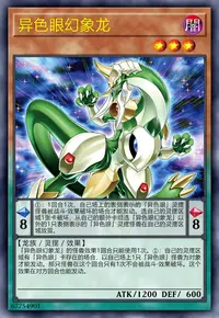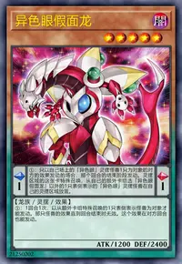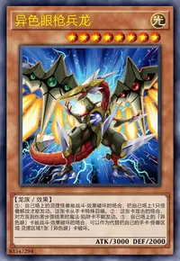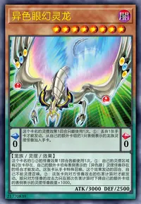 ①:这张卡在手卡的场合,把自己场上1只光属性怪兽解放才能发动。从手卡·卡组以及自己场上的表侧表示怪兽之中选1只「异色眼龙」送去墓地,这张卡特殊召唤。