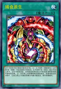 ①:从卡组把「捕食原生」以外的1张「捕食」卡送去墓地才能发动。从卡组把1张「融合」魔法卡加入手卡。这张卡的发动后,直到回合结束时自己不是龙族·植物族怪兽不能特殊召唤。