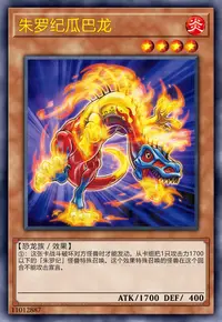 这张卡被战斗破坏的场合,在自己场上把2只「朱罗纪衍生物」(恐龙族·炎·1星·攻0/守0)守备表示特殊召唤。这衍生物不能为名字带有「朱罗纪」的怪兽以外的上级召唤而解放。