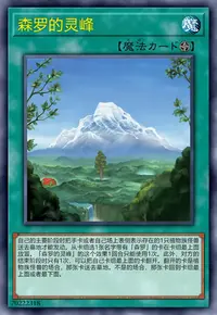 自己的主要阶段时把手卡或者自己场上表侧表示存在的1只植物族怪兽送去墓地才能发动。从卡组选1张名字带有「森罗」的卡在卡组最上面放置。「森罗的灵峰」的这个效果1回合只能使用1次。此外,对方的结束阶段时只有1次,可以把自己卡组最上面的卡翻开。翻开的卡是植物族怪兽的场合,那张卡送去墓地。不是的场合,那张卡回到卡组最上面或者最下面。