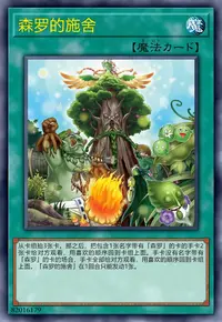 从卡组抽3张卡。那之后,把包含1张名字带有「森罗」的卡的手卡2张卡给对方观看,用喜欢的顺序回到卡组上面。手卡没有名字带有「森罗」的卡的场合,手卡全部给对方观看,用喜欢的顺序回到卡组上面。「森罗的施舍」在1回合只能发动1张。