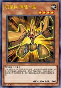 这张卡的攻击力上升这张卡以外的场上表侧表示存在的名字带有「机皇」的怪兽数量×200的数值。这张卡被战斗破坏送去墓地时,可以从自己卡组把1只名字带有「机皇兵」的怪兽特殊召唤。