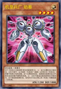 ①:自己主要阶段才能发动。这张卡破坏,从卡组把「机皇兵厂 助奏」以外的2只「机皇兵」怪兽守备表示特殊召唤。这个效果的发动后,直到回合结束时自己不是机械族怪兽不能特殊召唤。