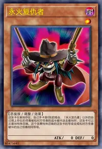 这张卡在墓地存在,自己手卡是0张的场合,「永火复仇者」以外的自己场上存在的怪兽被和对方怪兽的战斗破坏送去墓地时,这张卡可以从墓地特殊召唤。这个效果特殊召唤的这张卡的等级变成和对方怪兽破坏的自己怪兽相同等级。