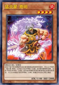 这张卡被卡的效果破坏送去墓地的回合的结束阶段时,可以从卡组把「猛炎星-鹿明」以外的1只名字带有「炎星」的4星怪兽特殊召唤。这张卡被名字带有「炎星」的同调怪兽的同调召唤使用送去墓地的场合,可以从卡组选1张名字带有「炎舞」的魔法卡在自己场上盖放。