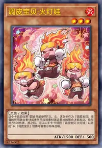 ①:这张卡作为「调皮宝贝」怪兽的所用融合素材或者所用连接素材送去墓地的场合才能发动。给与对方500伤害。那之后,可以从手卡·卡组把「调皮宝贝·火灯娃」以外的1只「调皮宝贝」怪兽守备表示特殊召唤。