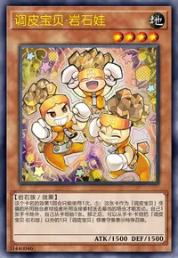 ①:这张卡作为「调皮宝贝」怪兽的所用融合素材或者所用连接素材送去墓地的场合才能发动。自己1张手卡除外,自己从卡组抽1张。那之后,可以从手卡·卡组把「调皮宝贝·岩石娃」以外的1只「调皮宝贝」怪兽守备表示特殊召唤。