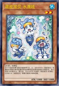 ①:这张卡作为「调皮宝贝」怪兽的所用融合素材或者所用连接素材送去墓地的场合才能发动。自己回复1000基本分。那之后,可以从手卡·卡组把「调皮宝贝·水滴娃」以外的1只「调皮宝贝」怪兽守备表示特殊召唤。