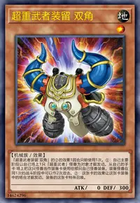 ①:自己主要阶段以自己场上1只「超重武者」怪兽为对象才能发动。自己的手卡·场上的这只怪兽当作守备力下降1000的装备卡使用给那只自己怪兽装备。装备怪兽不会被战斗破坏。