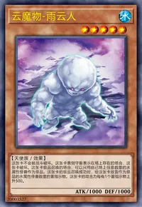 这张卡被战斗破坏送去墓地时,在自己场上把2只「云魔物衍生物」(天使族·水·1星·攻/守0)守备表示特殊召唤。这些衍生物不能作为名字带有「云魔物」的卡以外的祭品召唤的祭品。