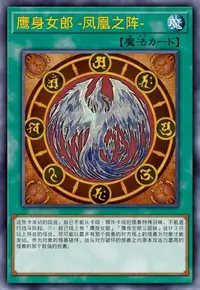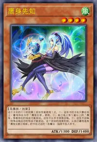 ①:从自己墓地的「鹰身女郎」「鹰身女郎三姐妹」之中以合计3只为对象才能发动。那些卡加入卡组洗切。那之后,自己从卡组抽1张。自己场上有5星以上的「鹰身」怪兽存在的状态发动的场合抽出的数量变成2张。这张卡的发动后,直到回合结束时自己不是风属性怪兽不能特殊召唤。