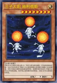 这张卡可以用自己场上的1只「双子太阳 赫利俄斯」作为祭品特殊召唤。这张卡的攻击力·守备力为从游戏中除外的怪兽卡数量×300的数值。这张卡被战斗破坏送去墓地的场合,结束阶段时攻击力·守备力上升500并特殊召唤。对方场上有怪兽存在的场合,只有1次可以继续进行攻击。