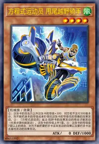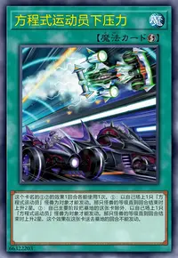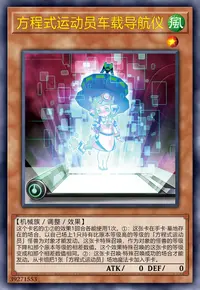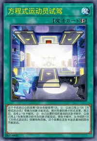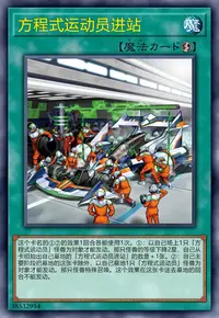 ①:以自己场上1只「方程式运动员」怪兽为对象才能发动。那只怪兽的等级下降2星,自己从卡组抽出自己墓地的「方程式运动员进站」的数量+1张。