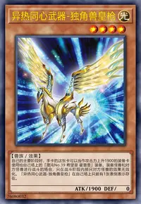 自己的主要阶段时,手卡的这张卡可以当作攻击力上升1900的装备卡使用给自己场上的「混沌No.39 希望皇 霍普雷」装备。装备怪兽和对方怪兽进行战斗的场合,只在战斗阶段内那只对方怪兽的效果无效化。「异热同心武器-独角兽皇枪」在自己场上只能有1张表侧表示存在。