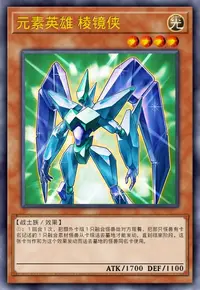 自身の『①:1ターンに1度、エクストラデッキの融合モンスター1体を相手に見せ、そのモンスターにカード名が記されている融合素材モンスター1体をデッキから墓地へ送って発動できる。エンドフェイズまで、このカードはこの効果を発動するために墓地へ送ったモンスターと同名カードとして扱う』モンスター効果によって、「元素英雄 棱镜侠」のカード名が「暗黑方界神 深红之挪婆」として扱われています。