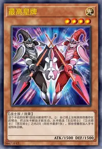 ①:自己场上没有其他怪兽存在的场合,把这张卡解放才能发动。从卡组选「王后骑士」「卫兵骑士」「国王骑士」之内2只(同名卡最多1张)。那些怪兽各加入手卡或特殊召唤。