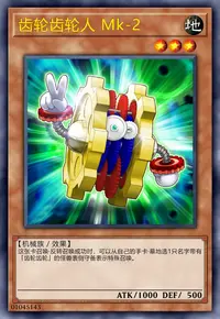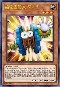 这张卡用名字带有「齿轮齿轮」的卡的效果特殊召唤成功时,可以从自己的手卡·墓地选「齿轮齿轮人 Mk-3」以外的1只名字带有「齿轮齿轮」的怪兽表侧守备表示特殊召唤。这个效果特殊召唤的怪兽的效果无效化。「齿轮齿轮人 Mk-3」的效果1回合只能使用1次,这个效果发动的回合,自己不能把名字带有「齿轮齿轮」的怪兽以外的怪兽特殊召唤。