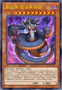 这张卡不能通常召唤。「蛇神降临」的效果以及这张卡的效果才能特殊召唤。这张卡的攻击力上升自己墓地的爬虫类族怪兽数量×500的数值。这张卡只要在场上表侧表示存在,不会成为这张卡以外的卡的效果的对象,也不受效果影响。这张卡被战斗破坏送去墓地时,可以通过把这张卡以外的自己墓地1只爬虫类族怪兽从游戏中除外,这张卡特殊召唤。这张卡给与对方基本分战斗伤害时,给这张卡放置1个超毒指示物。这张卡有3个超毒指示物放置时,这张卡的控制者决斗胜利。