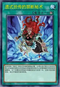 「紧急仪式术」の『自分フィールドに儀式モンスターが存在しない場合、自分の手札・墓地から儀式魔法カード1枚を除外して発動できる。このカードの効果は、その儀式魔法カード発動時の儀式召喚する効果と同じになる』効果のコストとして、「遗式世传的禁断秘术」を除外しました。