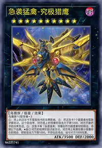 ①:以这个回合被战斗破坏送去自己墓地的1只「急袭猛禽」超量怪兽为对象才能发动。那只怪兽特殊召唤,那只怪兽的2倍阶级的1只超量怪兽在作为对象的怪兽上面重叠当作超量召唤从额外卡组特殊召唤。