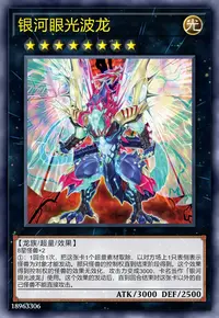 ①:1回合1次,把这张卡1个超量素材取除,以对方场上1只表侧表示怪兽为对象才能发动。那只怪兽的控制权直到结束阶段得到。这个效果得到控制权的怪兽的效果无效化,攻击力变成3000,卡名当作「银河眼光波龙」使用。这个效果的发动后,直到回合结束时这张卡以外的自己怪兽不能直接攻击。