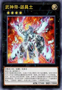 这张卡超量召唤成功时,从自己卡组上面把5张卡送去墓地。这张卡的攻击力上升这个效果送去墓地的名字带有「武神」的卡数量×100的数值。此外,自己场上的名字带有「武神」的兽战士族怪兽被战斗或者卡的效果破坏的场合,可以作为那1只破坏的怪兽的代替而把这张卡1个超量素材取除。「武神帝-迦具土」在自己场上只能有1只表侧表示存在。